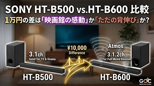 - 一言でいうと?:天井まで音が広がる「映画館体験」が欲しいならHT-B600、声の聞き取りやすさと重低音だけで十分ならHT-B500です。